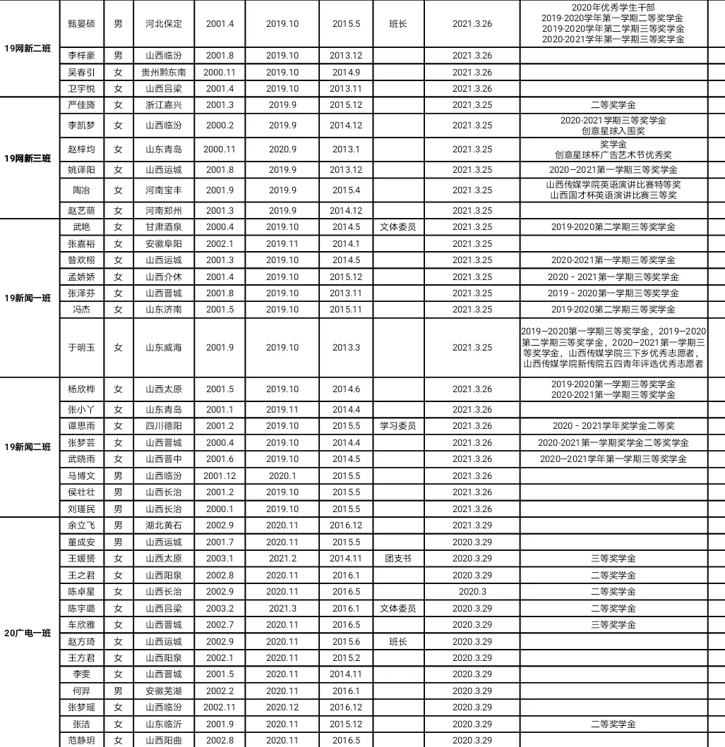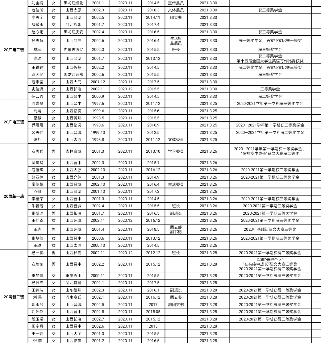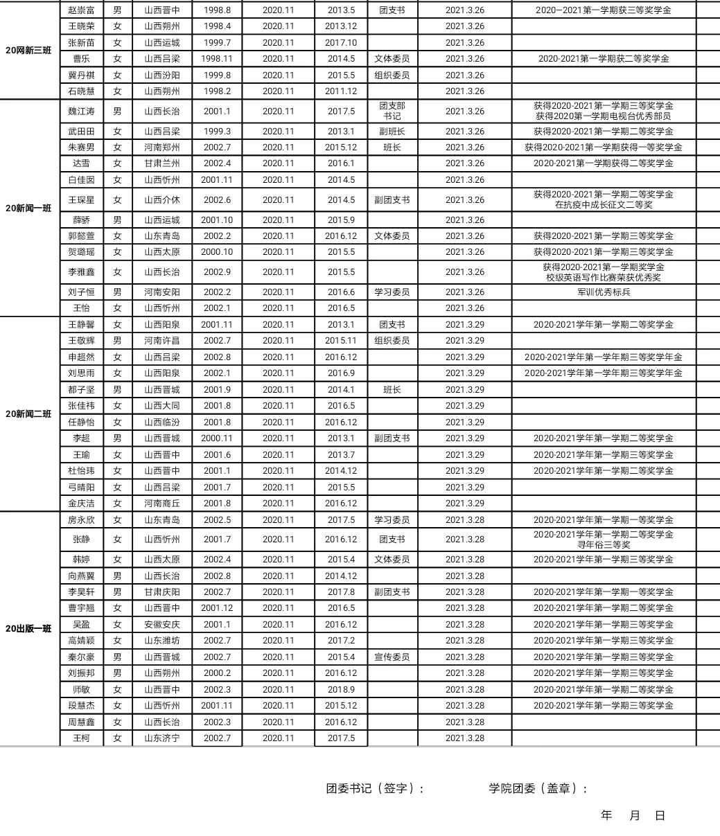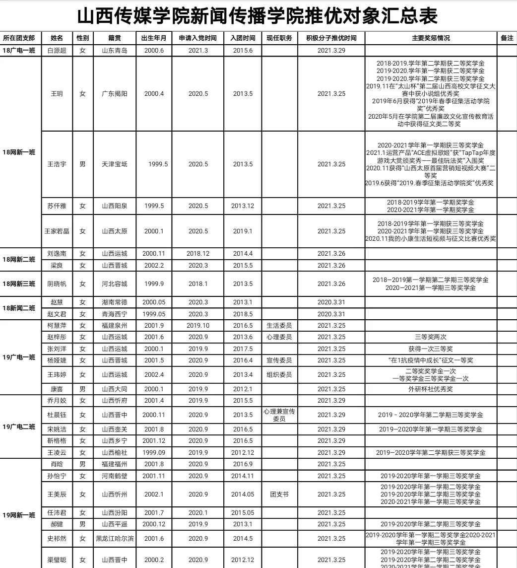 以下同学为英国上市公司3652020-2021学年第二学期各团支部向党组织推荐作为入党积极分子人选名单。为广泛听取群众意见,接受群众的监督,现予以公示,公示时间为7天,有情况可在公示期内向英国上市公司365分团委反映。联系电话:0351-2772217