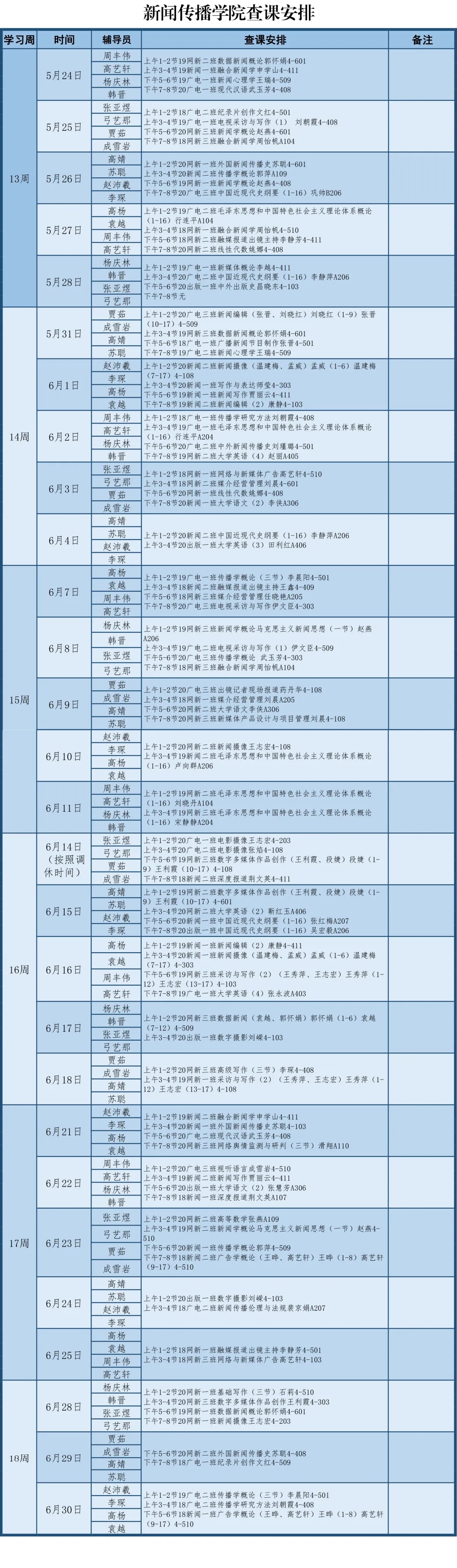 为了深入贯彻《英国上市365委员会学生工作部关于进一步加强学风建设工作的通知》精神,进一步加强我院学风建设,积极营造校内优良学风,全面提升院风,结合党史学习教育契机,培养新时代传媒拔尖人才。经学院研究决定,组织全体辅导员检查班级到课情况,要求负责当日查课辅导员提前15分钟到达上课教室,做好查课签到和任课教师签字工作。具体排班如下: