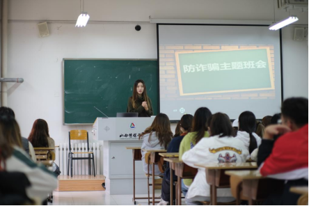 在班会上,二班班长陈冉同学通过分享真实案例和相关视频,为大家着重讲解了让学生群体屡屡“中招”的常见诈骗类型:刷单返利诈骗、冒充电商物流客服诈骗、注销“校园贷”诈骗、网络游戏产品虚假交易诈骗、冒充熟人诈骗等。除此之外,在校园诈骗案例中,求职被骗、奖助学金被骗、自身信息保管不好被泄露、提供考题类被骗等都是比较常见的情况。
