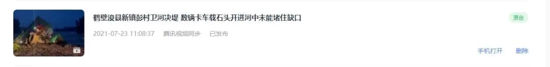 鹤壁浚县新镇彭村卫河决堤 数辆卡车载石头开进河中未能堵住缺口